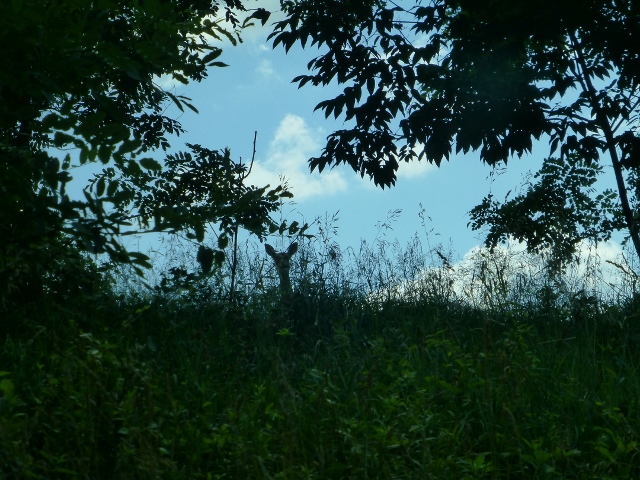 鹿,这次看到数次,但根本来不及拍摄,它们敏捷地从我的前面或侧面鹿跳而过,还不及对焦就消失在林子里了。这是一只躲在草丛后面盯着我的鹿,被我拍到鹿影。