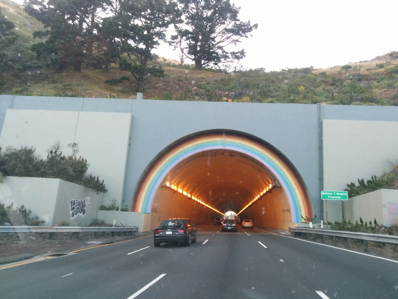 一張不甚起眼的照片,畫有彩虹的隧道口,十八年前還住在北加時,曾經常常經過隧道往返金山。今天女兒把照片傳來,提及她五歲時認為,那彩虹是媽媽畫的,今天無意在開車旅行中經過隧道,莞爾順手拍下了照片。