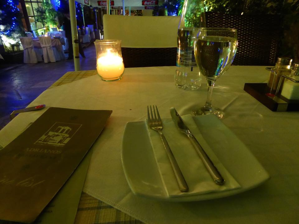 This small restaurant is located on the slopes by the end of the street. A few tables neatly arrayed outside of the restaurant. The burning candle in white glass jar quivered continuously. The tables were covered with white cloths which were typical Greek color white. They reminded us the white Caryatids columns from Acropolis.
