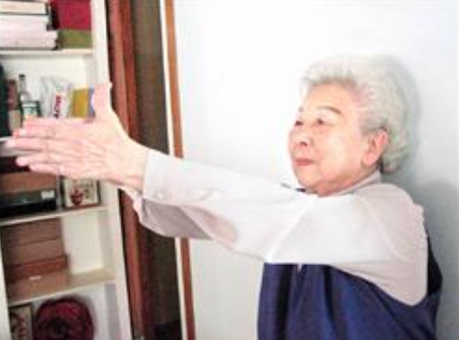 莊淑旂指出,民眾也可以在睡前做一些疲勞消除準備動作。首先,全身站直(身軀背貼牆壁)、雙手手臂向前伸直(比肩膀略高)、合掌(四指併攏、虎口用力張開)(圖一),兩手平行向兩邊盡量伸直展開(展開至比肩膀略後)(圖二),來回擺動12次,民眾可來回重複。手臂向前伸直時,手部動作依序為合掌、掌心向下、手背對手背、掌心向上。