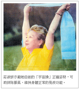 莊淑旂示範她自創的「宇宙操」正確姿勢,可助排除脹氣、維持身體正常的免疫功能。