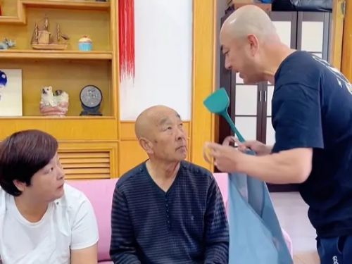 家庭生活歡樂多,快樂很簡單,兒子兒媳逗老爸開心,搞笑一下,開心就好。