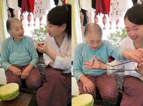 婆婆真聰明,這樣子也能把翡翠手鐲取下來。家庭生活歡樂多,快樂很簡單,媳婦逗婆婆玩,開心就好。