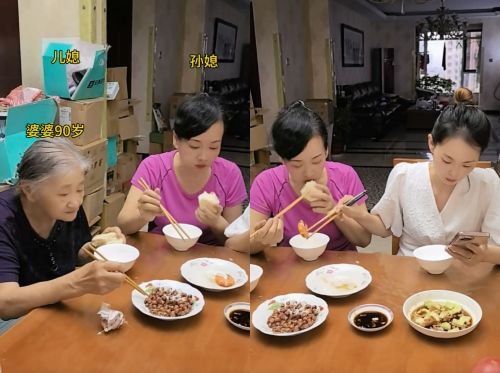 兒媳婦、孫媳婦陪伴婆婆吃飯,小小的動作、細節體現了兩代媳婦的涵養與孝順,非常溫馨幸福的畫面。