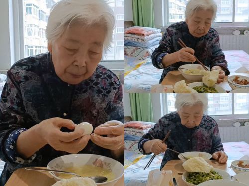老媽在吃飯,有雞蛋、饅頭、蔬菜,還有小米粥,有營養,又健康,祝願老媽健健康康、快快樂樂、開開心心。