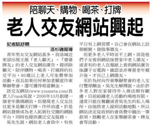 該交友網站(www.youmeta.com)負責人Frank吳說,2006年10月創建一個老年徵偶網站,但發現老人交友往往更多是聊天打牌、作伴消遣,於是網站發展成為老人拓展社交圈的網路平台,同時也提供廣泛交友服務。吳先生說,網站老人會員中,有些平日有上網習慣,自己會在網站上註冊帳號,發啟事徵友。但更多老人平時並不上網,而是他們子女看到網站後替家中老人徵友,或者有的老人在報紙上看到網站廣告後讓子女電詢,確認並非專營老年婚介後,才自己上網徵友。