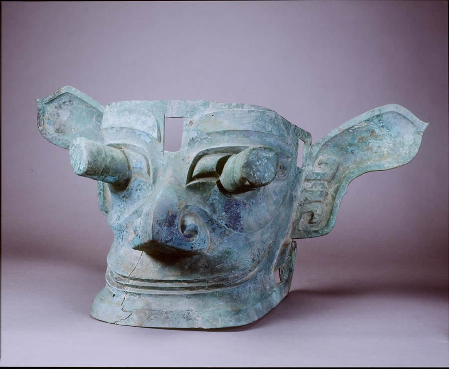 肅穆的紛圍下,解說人員低聲解說著有限的資訊,夾縫黃土高原顏色的青銅猙獰面具,似乎想吞噬面前的人,然而後天的黏痕,缺陷的方口,透露了它遺失的輝煌。