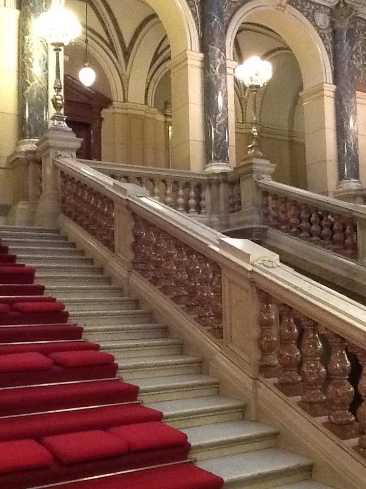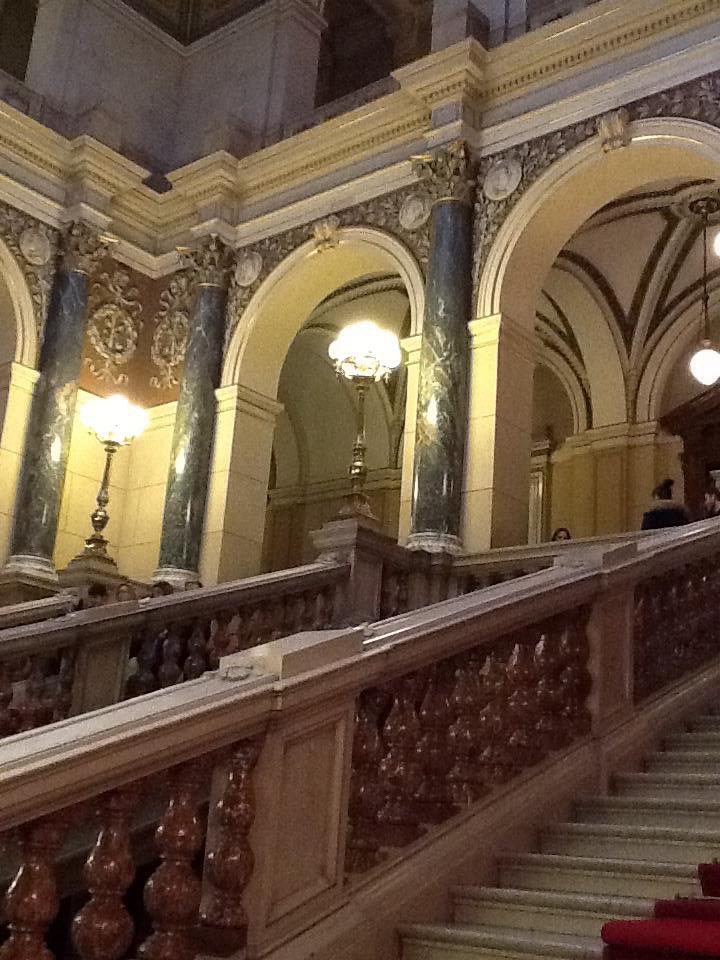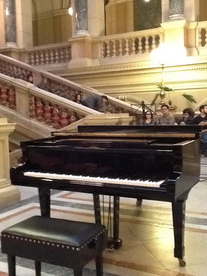 提前二十分鐘入場,裡面有四個階梯分別從四個方向中間匯合然後才是通往前門的寬型台階,階梯匯合處不大的空間擺著一架黑色鋼琴,兩把椅子,四個樂譜架子,左邊兩排椅子背對表演區已有人坐滿,四處階梯上鋪著大紅色地毯及軟墊,只有十來個人,原來音樂演奏會對觀光客來説一點也不熱門,我挑了左邊的第一排的椅子坐下,是對著鋼琴演奏者的背部,但是鋼琴一覽無疑,正對著樂譜腳架,是個很完美的位置。