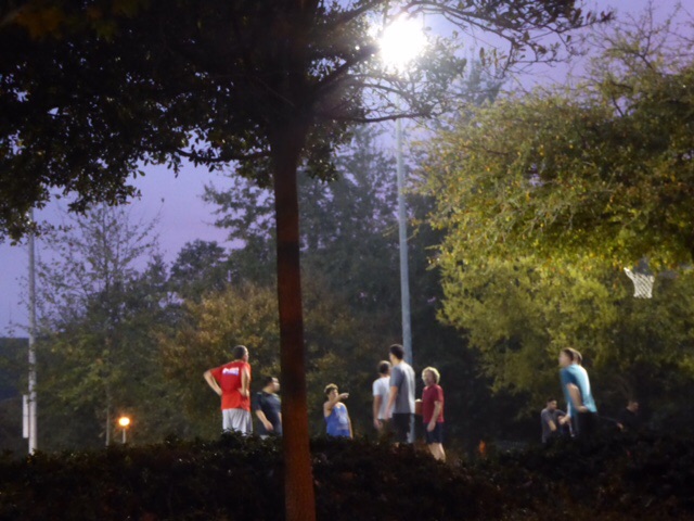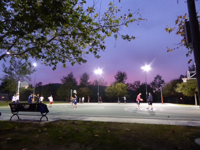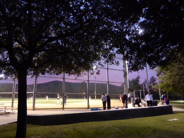 傍晚溫柔的霞光搭配著公園的燈光,籃球場上三三兩兩的年輕人投著球,旁邊棒球場外圍觀子女打球的父母,專注著綠綠的草地上打棒球的孩子,此情此景正是以前所謂的太平盛世。