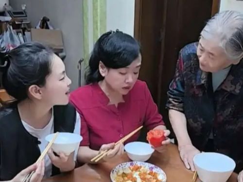兒媳配合孫媳,逗奶奶玩,叫奶奶別炒菜,家庭生活歡樂多,快樂很簡單,開心就好。