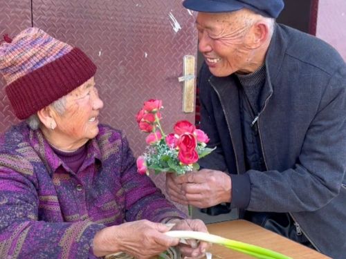 老頭子送花給老伴,哄老伴開心,看看老伴多麼開心,溫馨的畫面令人羡慕、感動。老年夫妻歡樂多,快樂很簡單,開心就好。